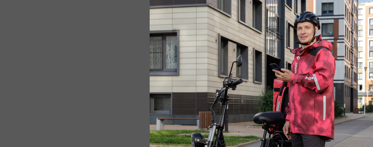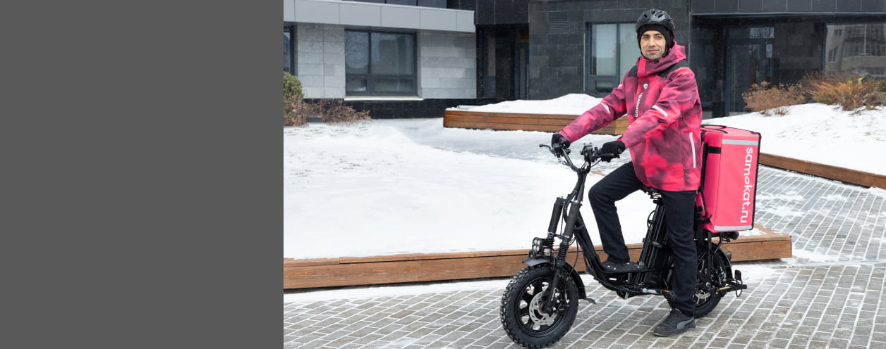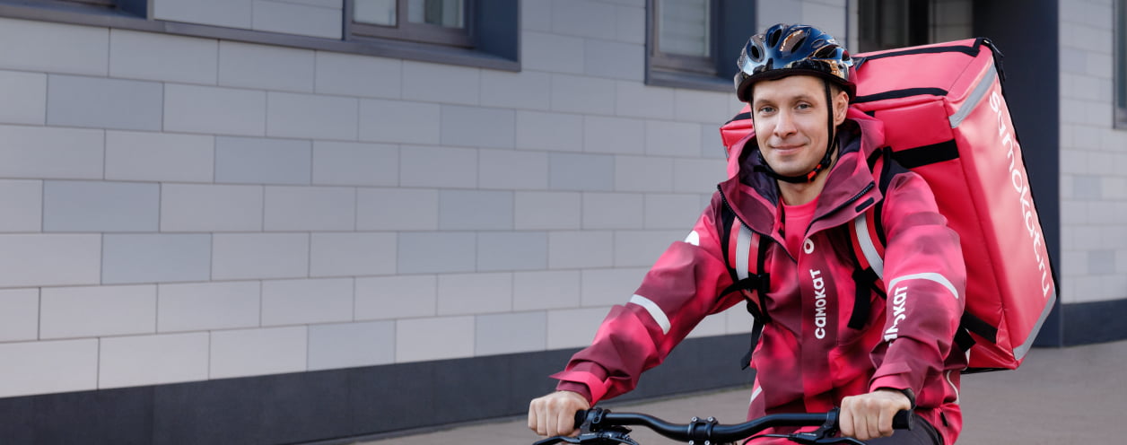 А ещё выдаём бесплатный электровелосипед, непромокаемую удобную форму, сумку и шлем. Плюс на период доставки у тебя будет страховка от несчастных случаев, ведь безопасность превыше всего.